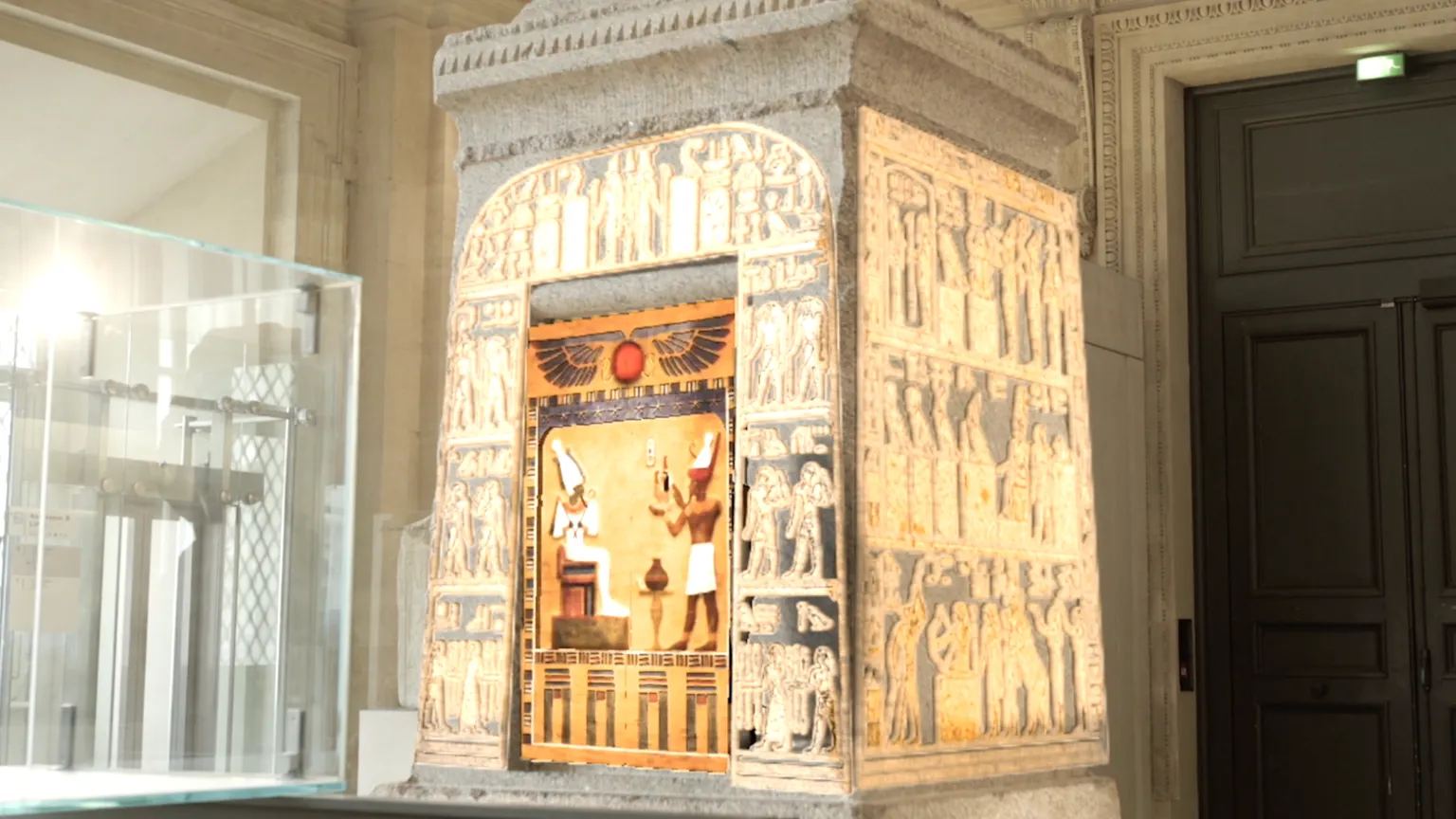 The "Chamber of Ancestors," a carved tomb interior from 1450 BC representing Ancient Egyptian dynasties, is recreated in the glorious technicolor of its original pigments. Meanwhile, the pink granite bas-reliefs of the four-sided shrine, The 550 BC "Naos of Amasis," are transformed back to their original state. Its wooden doors open to reveal a statue of the god Osiris once housed within.